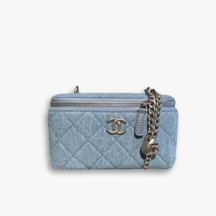 Chanel Camellia Denim Vanity Bag With Heart Chain Light Blue 18cm