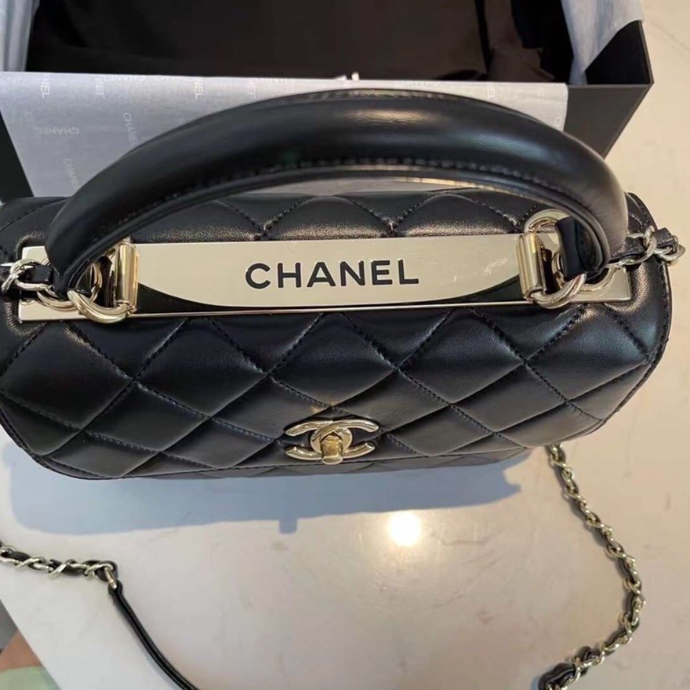 Chanel CC Trendy leather Bag Black 25cm – The Timeless Elegance collection redefines classic sophistication with exquisite craftsmanship. This black quilted top-handle bag features a signature interlocking CC logo in gold-tone hardware, a structured flap closure, and a refined leather-threaded chain strap, offering a seamless blend of luxury and versatility.