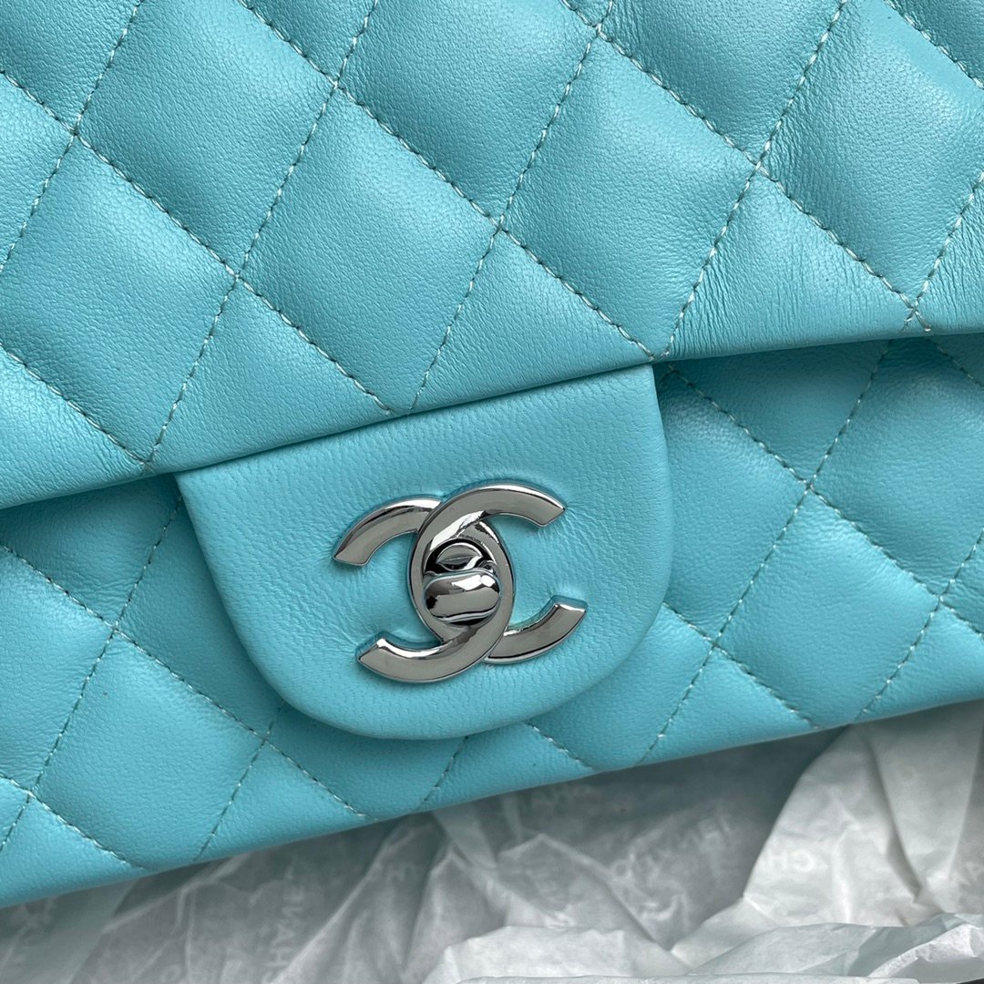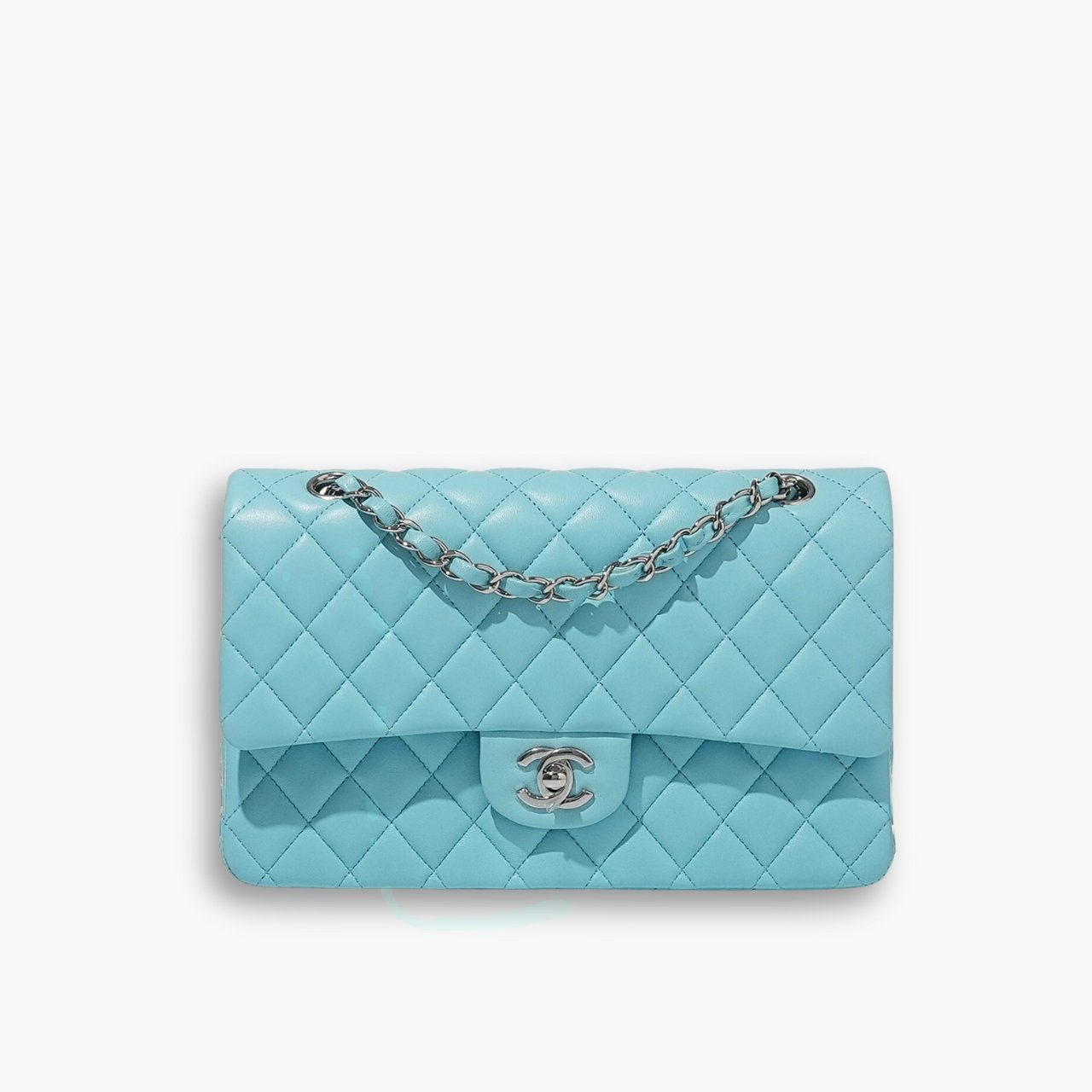The Chanel Classic Bag in Lambskin & Silver Metal (Light Blue) exudes a soft, feminine charm. Its delicate light blue hue enhances the graceful elegance of the design, while the silver-tone accents add a modern touch. Bright and radiant, this bag is the perfect blend of beauty and sophistication.