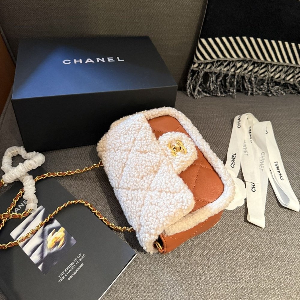 The Chanel Flap Bag in Shearling Lambskin Brown is a cozy yet luxurious piece, featuring soft lambskin shearling in a warm brown tone. Its compact size and signature flap design make it effortlessly chic, ideal for adding a touch of elegance to seasonal outfits. A timeless accessory with a unique texture, it brings both comfort and sophistication to any look.