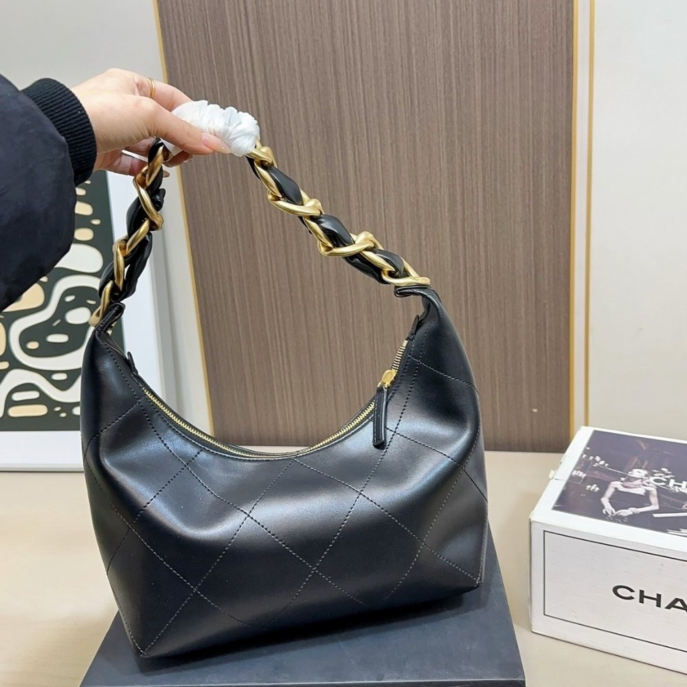 Chanel Hobo Handbag Shiny And Gold Tone Metal Black 24Cm