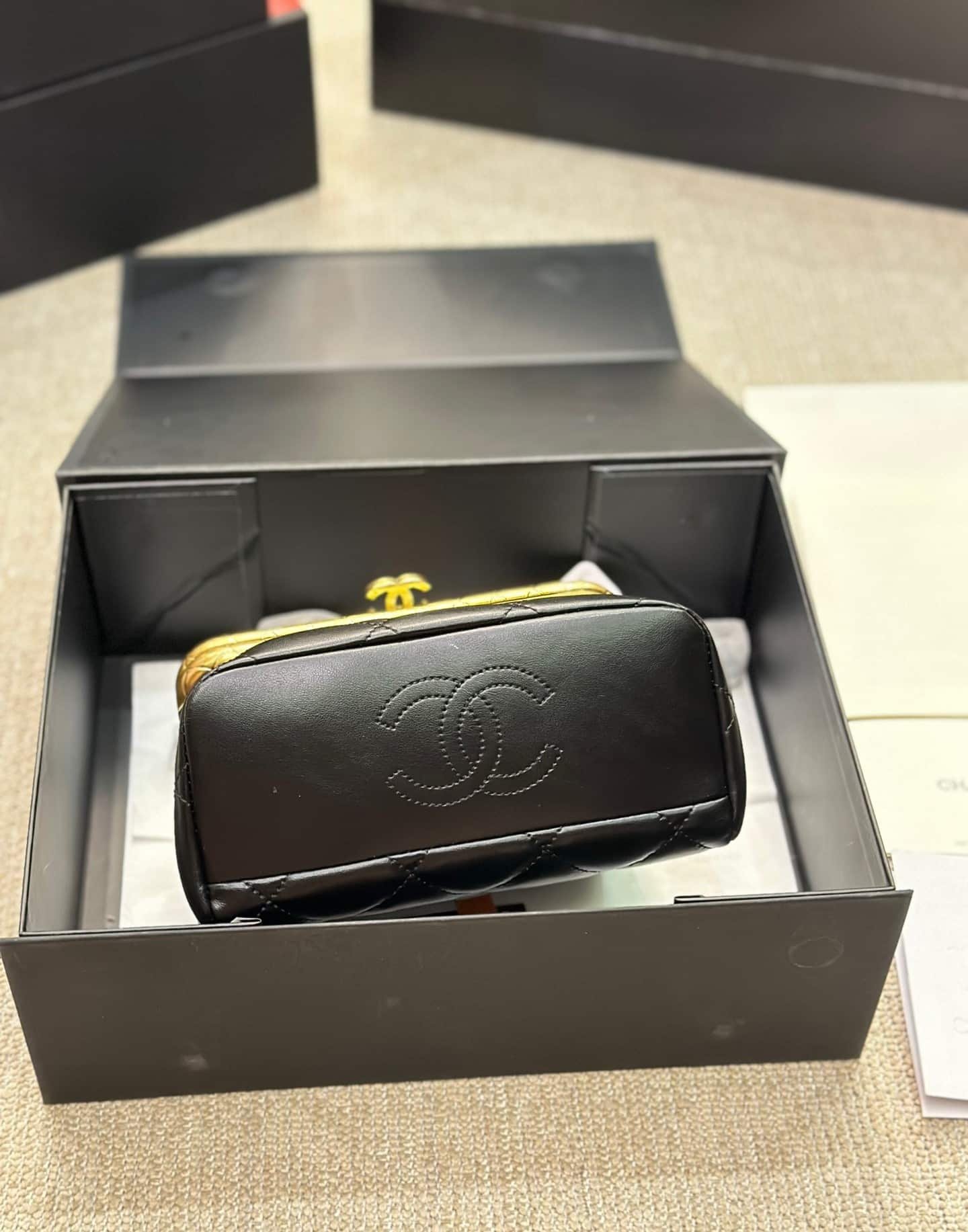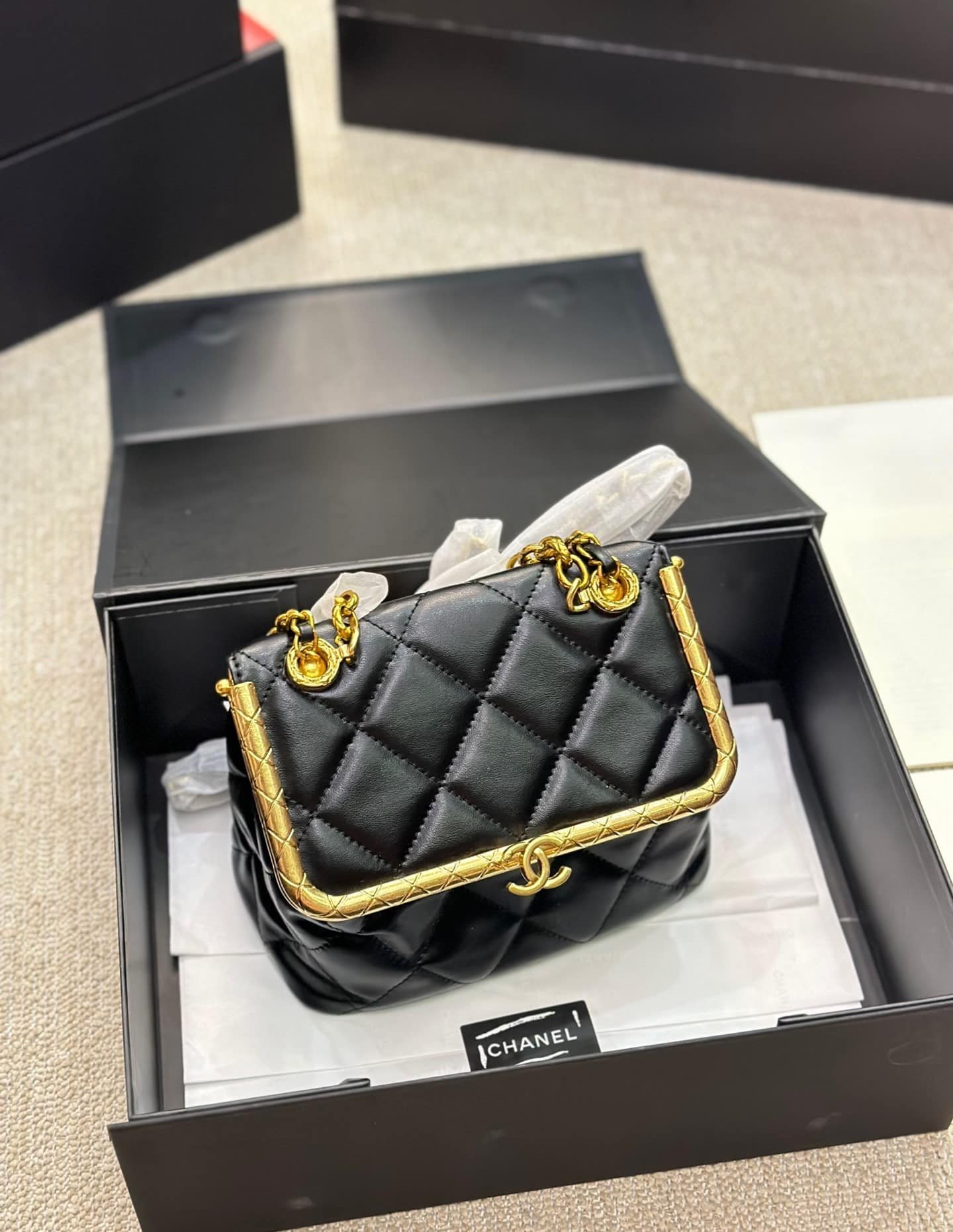 Chanel Kiss Lock Evening Black Leather Quilted 19Cm