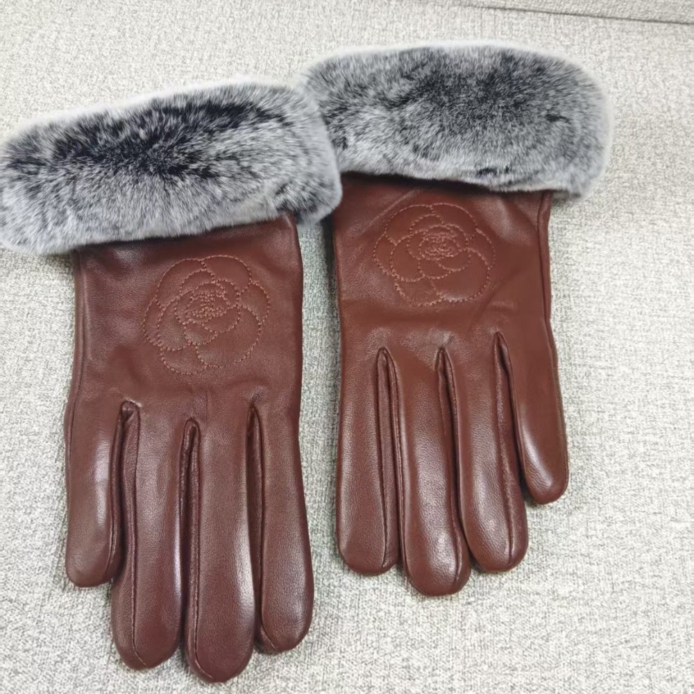Chanel Leather Gloves With Camellia Flower Brown