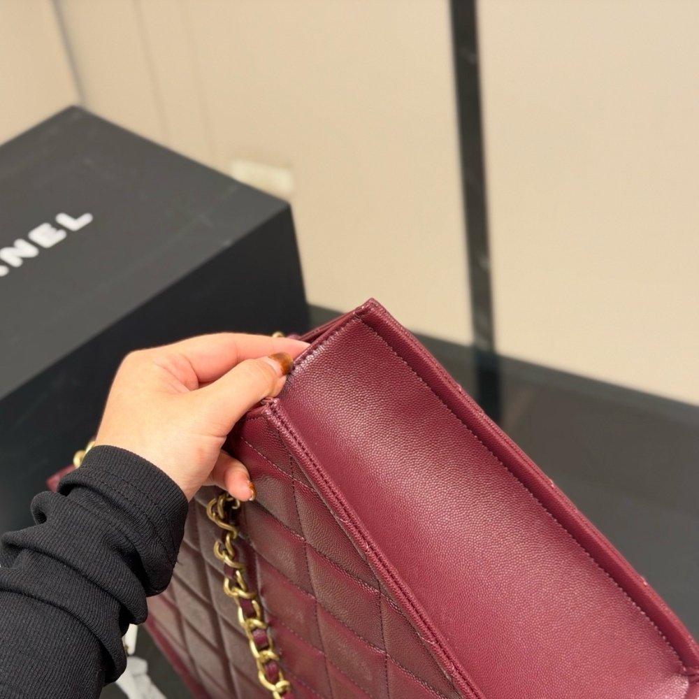 The Chanel Small Shopping Bag in Burgundy is an exquisite and practical tote that exemplifies the House’s dedication to blending daily utility with high-fashion elegance. This model is crafted from premium grained leather, offering a durable yet luxurious pebbled texture that is beautifully complemented by polished gold-tone metal hardware.
