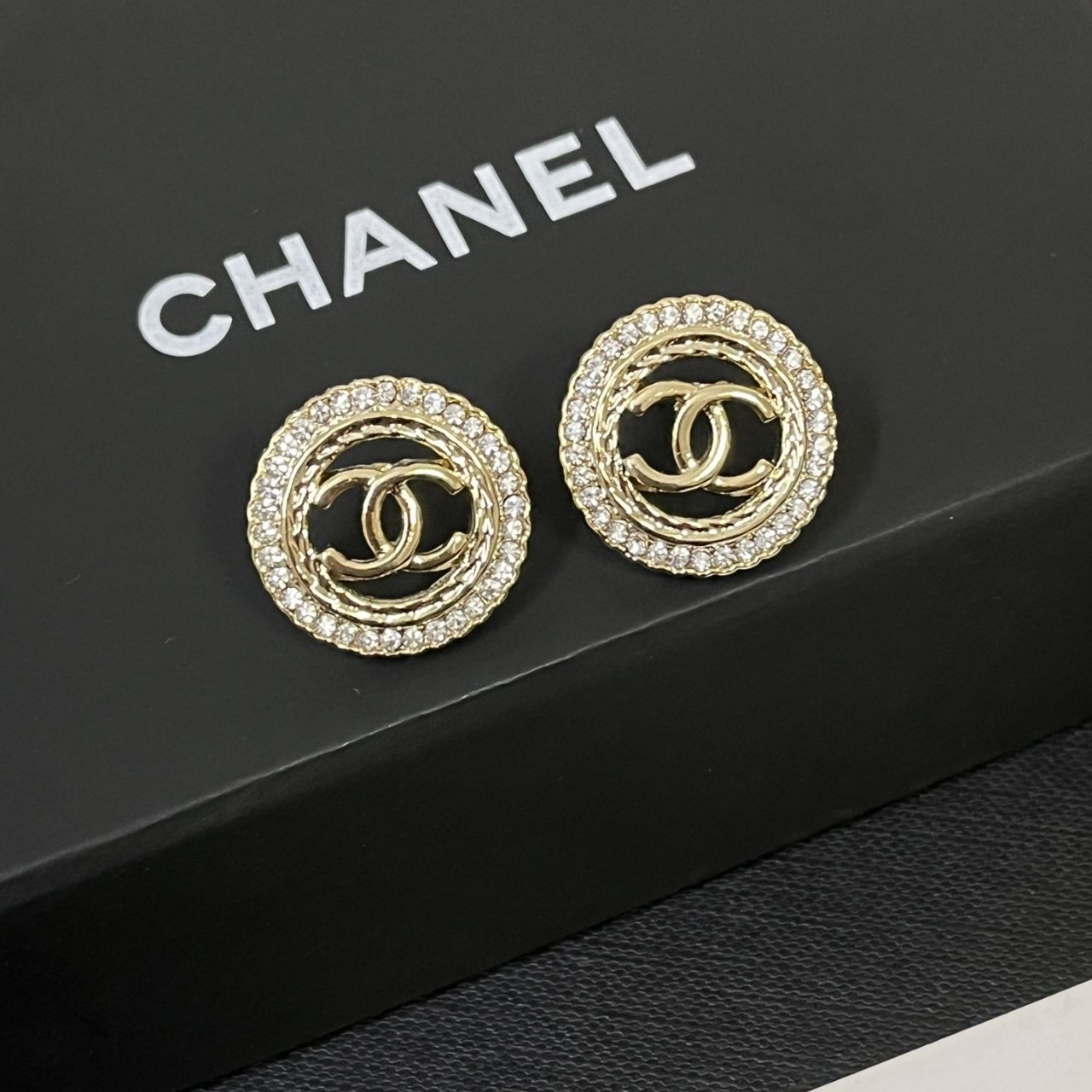 These are Chanel round stud earrings with a chic and elegant design. The center features the iconic interlocking CC logo in gold, framed by a twisted rope-style circle. Surrounding the edge is a border of sparkling crystals, adding a luxurious and timeless touch.
