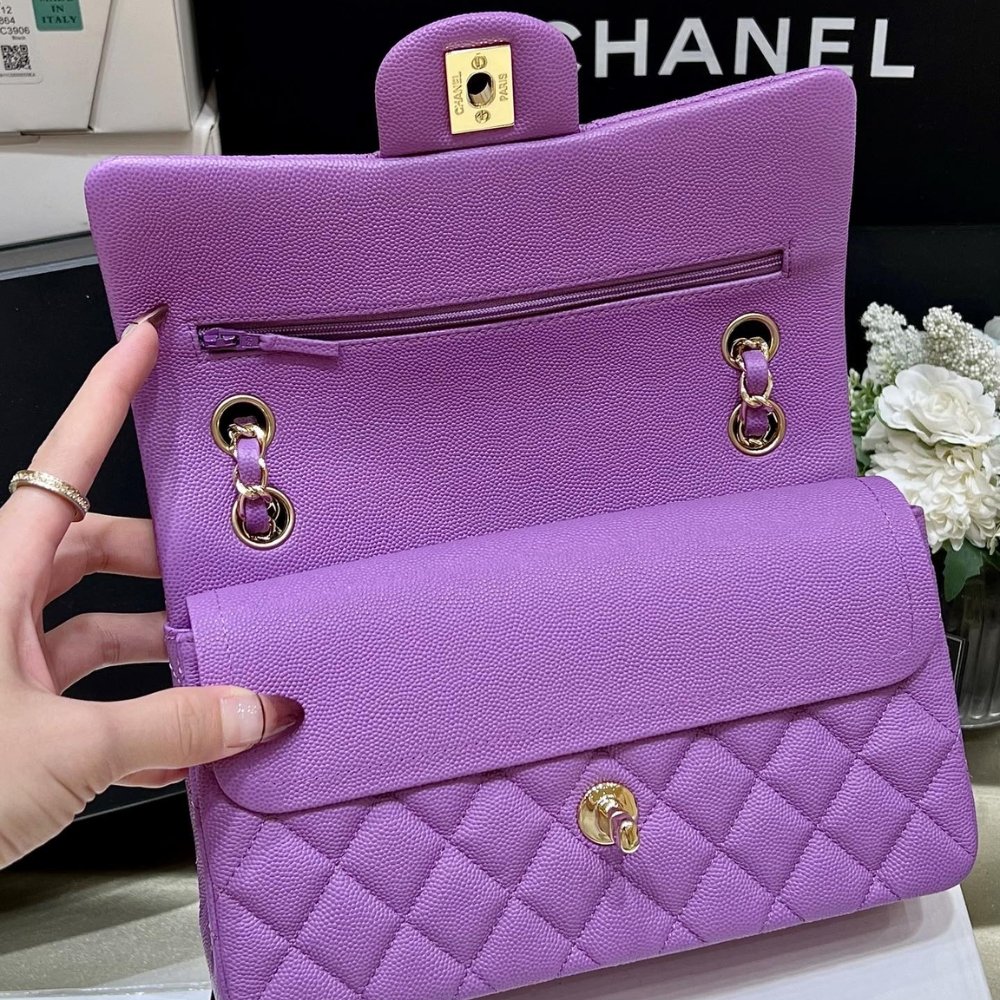 The Chanel Timeless Caviar Flap Bag in Violet embodies soft elegance with a trendy twist. Its luxurious violet hue adds a touch of regal charm, while the durable caviar leather ensures lasting beauty. Perfectly blending sophistication and subtle boldness, this bag is a must-have for effortless style.