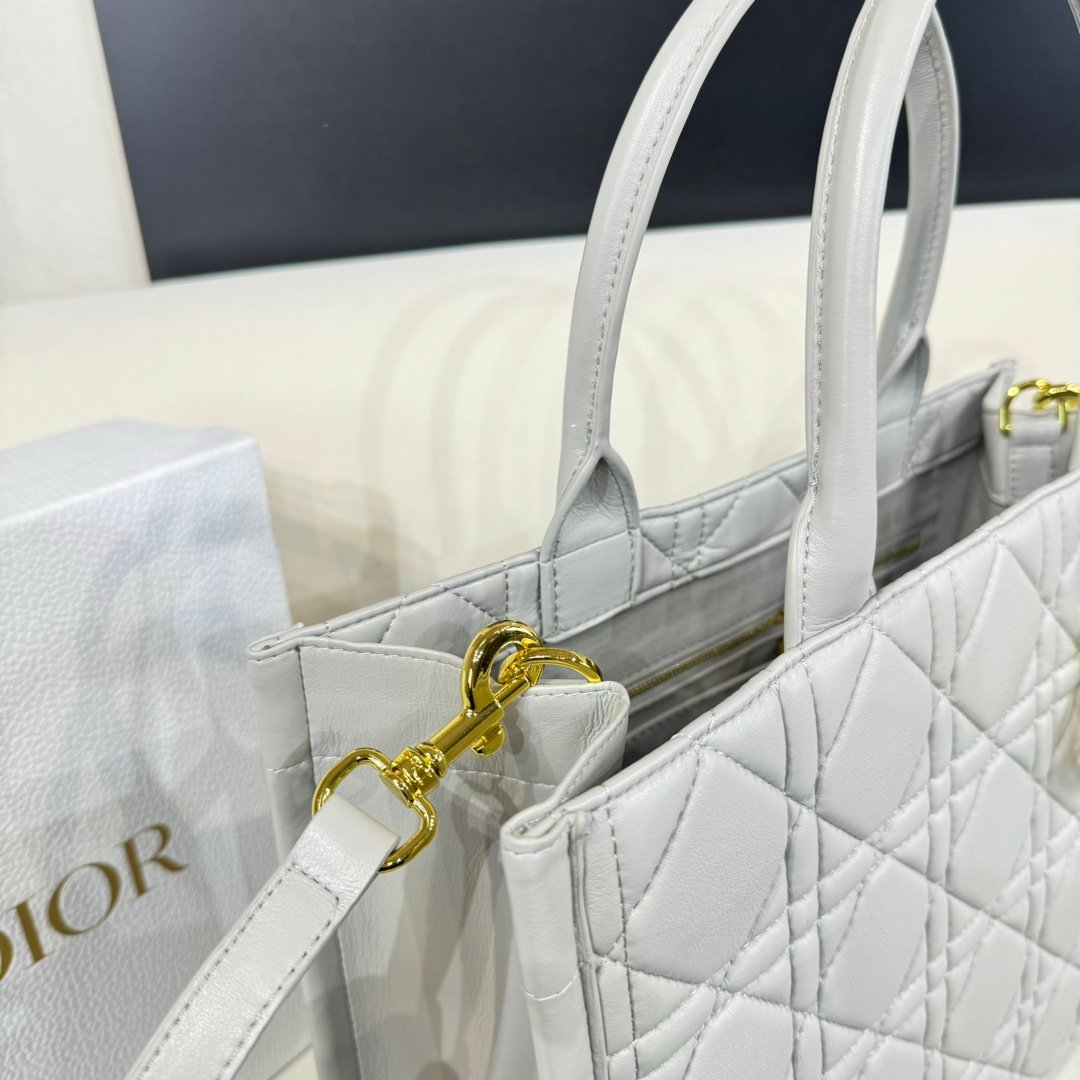 Dior Book Tote is available in an elegant new variation. Crafted in calfskin, the design showcases the Macrocannage motif and is embellished with pale gold-finish metal D.I.O.R. charms on one of the top handles. Medium tote is a prime example of Dior savoir-faire and may be carried by hand or worn over the shoulder.