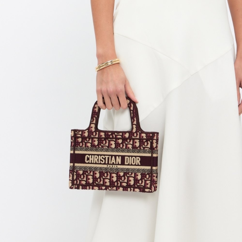 The Dior Mini Book Tote in Burgundy is a refined blend of compact elegance and striking color. Crafted from embroidered canvas with the iconic Dior motif, its rich burgundy hue adds a bold, sophisticated touch. Ideal for carrying your essentials, this mini tote is a stylish accessory for special occasion.