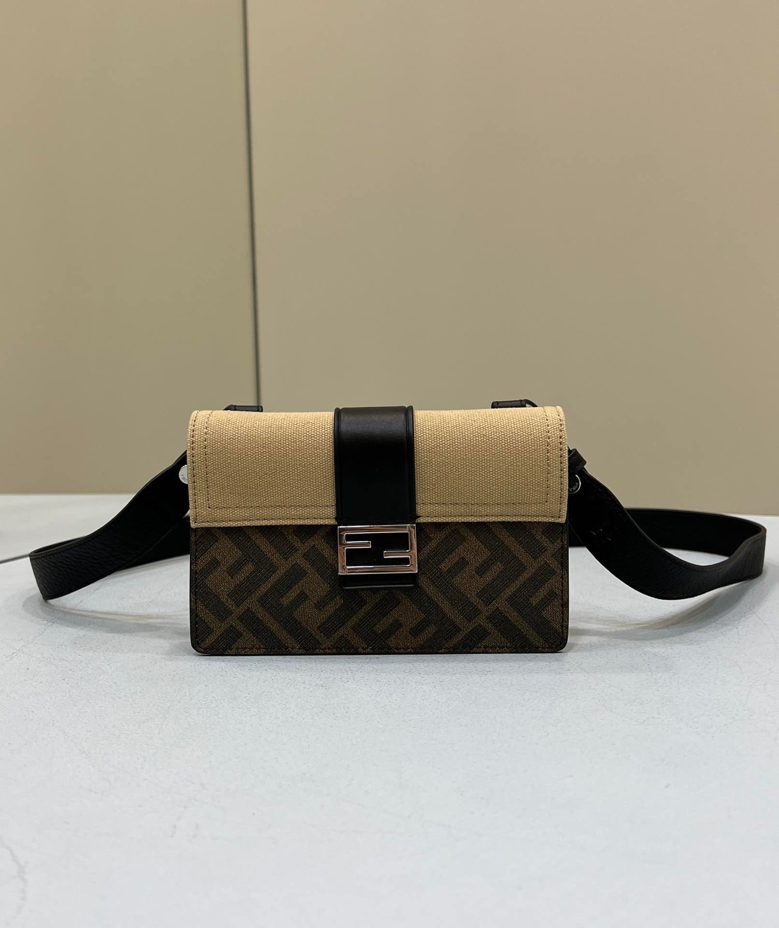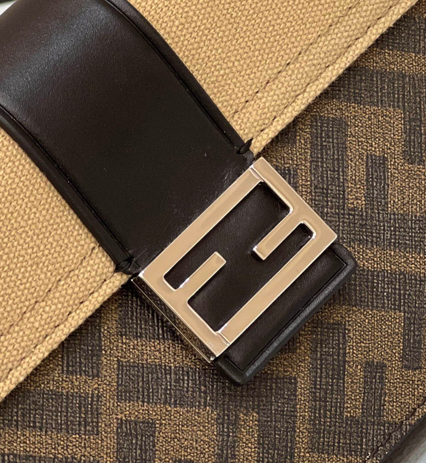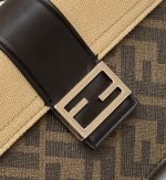 Baguette pouch with square flap and FF magnetic clasp. Can be worn at the waist, over the shoulder or cross-body by attaching the removable strap. Lining with zipper pocket. Made of fabric with FF motif. Embellished with natural canvas flap and black leather details. Palladium-finish metalware.