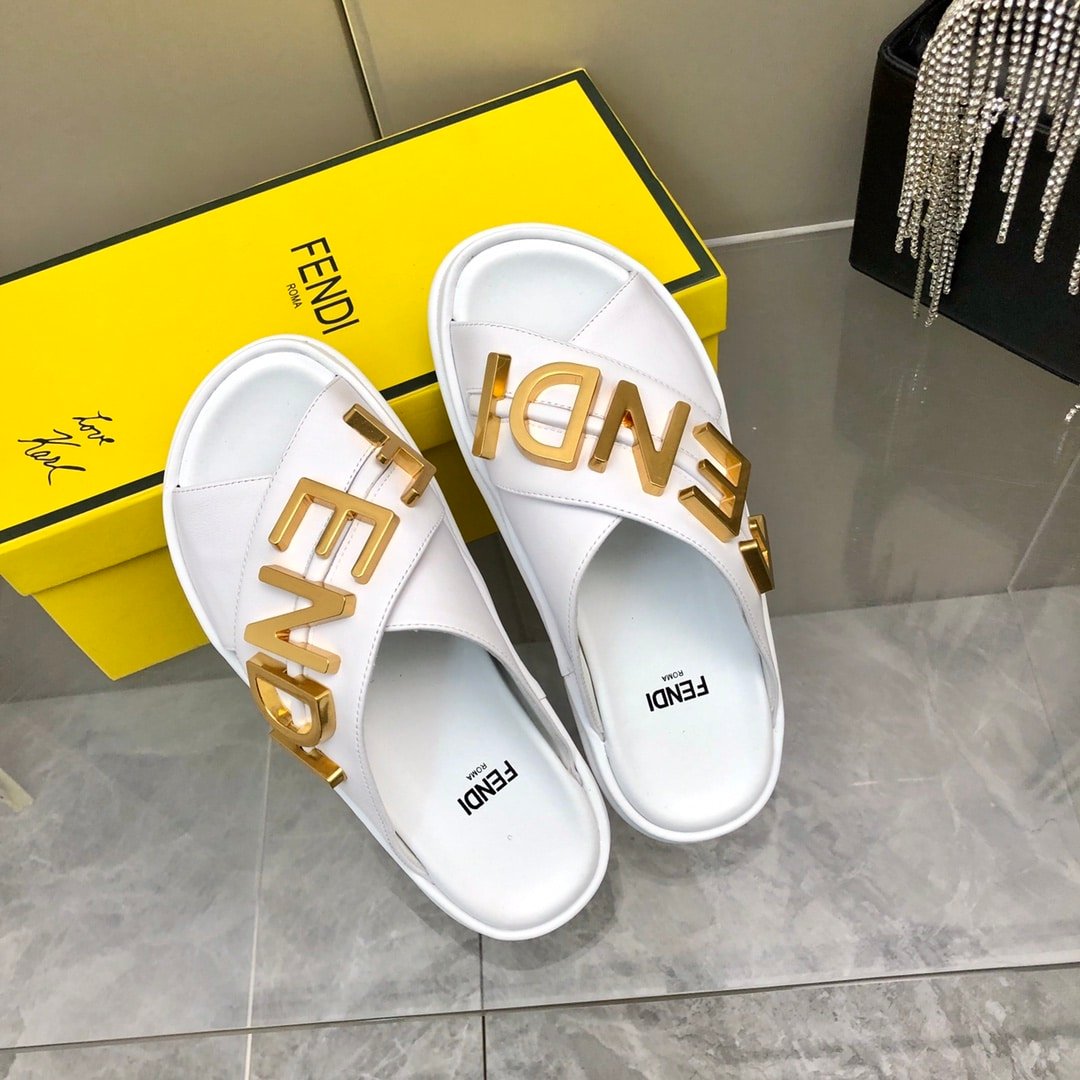 The Fendi Fendigraphy Slides White are a luxurious blend of simplicity and elegance. Crafted from premium black leather, the wide strap provides a snug and comfortable fit. The standout feature is the bold gold-tone “FENDI” logo adorning the side of the sole, adding a striking visual appeal. Designed with a lightweight and durable rubber sole, these slides offer both style and ease,