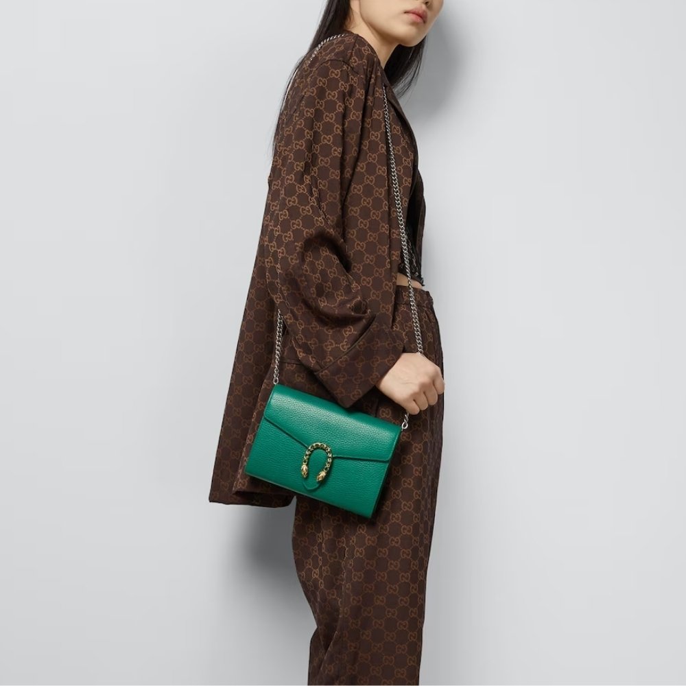 The textured bag is crafted in green leather. The closure is adorned with the line’s unique, unmistakable symbol: the textured tiger’s head spur, which is a nod to the Greek god Dionysus, who, according to legend, crossed the Tigris River on a tiger sent by Zeus.