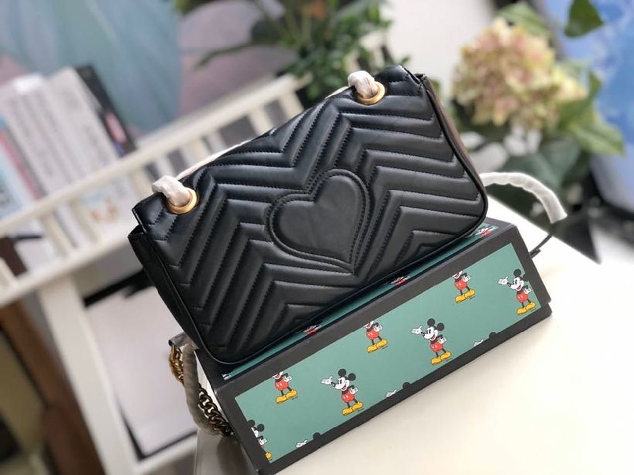 The small GG Marmont chain shoulder bag has a softly structured shape and an oversized flap closure with Double G hardware. The sliding chain strap can be worn multiple ways, changing between a shoulder and a top handle bag. Made in matelassé chevron with a heart on the back.