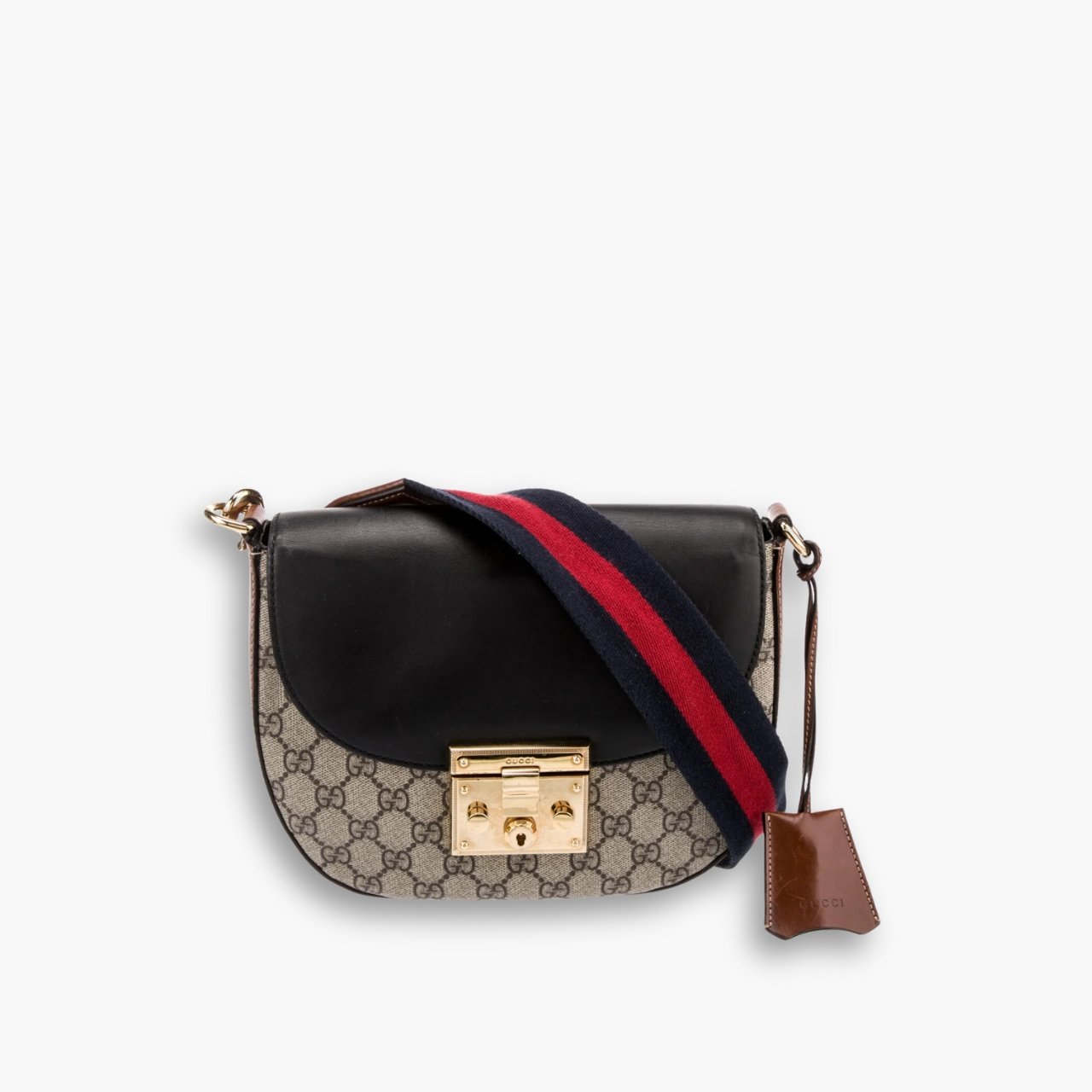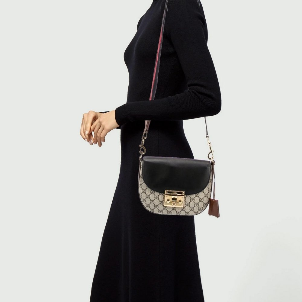 The Padlock’s structured shape is presented in canvas with a leather upper. Recalling the brand’s origins in the world of leisure and luggage, the small shoulder bag is defined by its padlock closure. The bag features a signature black and red web shoulder strap. This limited-edition bag is crafted from high-quality leather, ensuring a luxurious feel and exceptional durability.