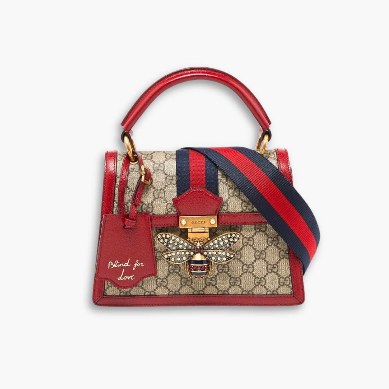 The Gucci Queen Margaret GG Small Top Handle Bag in Red is a perfect blend of timeless elegance and modern flair. Featuring the iconic GG Supreme canvas paired with rich red leather, this piece is adorned with a stunning pearl-studded bee closure. Its structured silhouette and top handle design make it an ideal accessory for both day and evening ensembles.