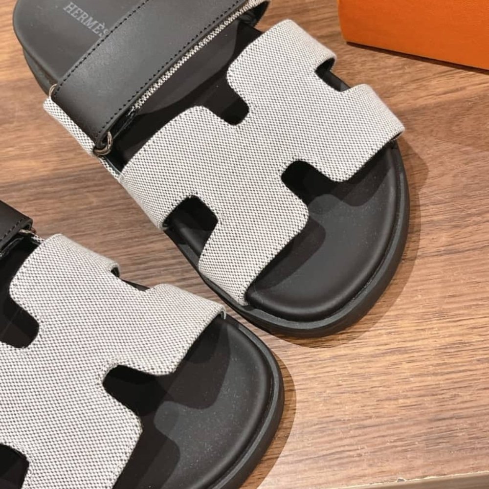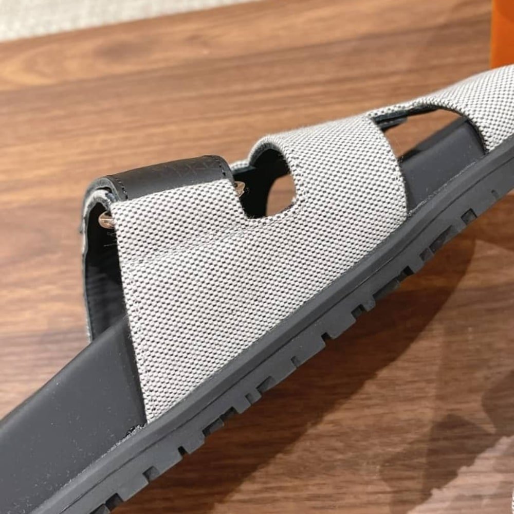 - The Hermes brand sandals feature a canvas upper and leather lining on the inside.
