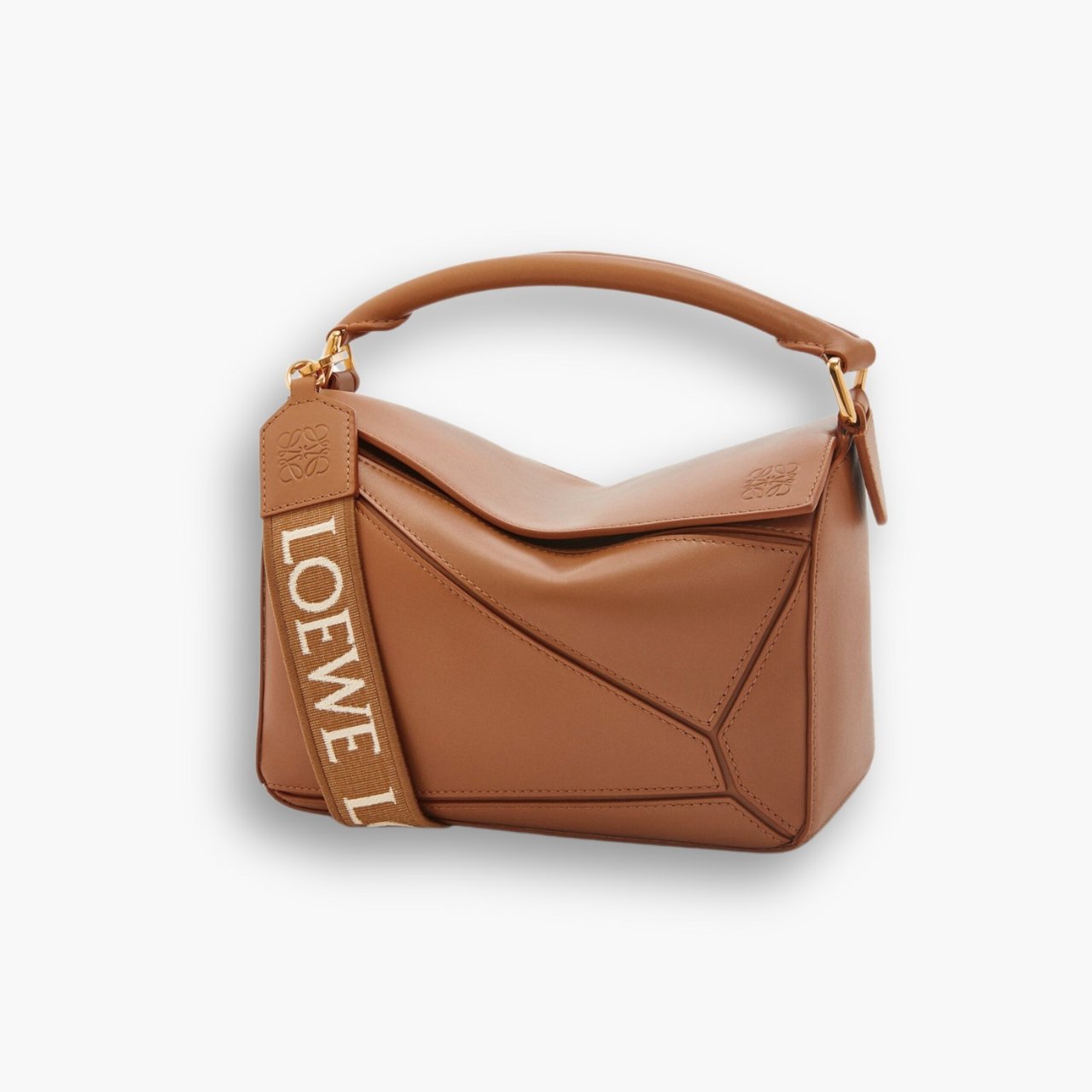 The Puzzle bag is the debut bag for LOEWE by Creative Director Jonathan Anderson. A cuboid shape and precise cutting technique create Puzzle’s distinctive geometric lines. This small version is crafted in satin calfskin and comes with a detachable LOEWE jacquard strap.