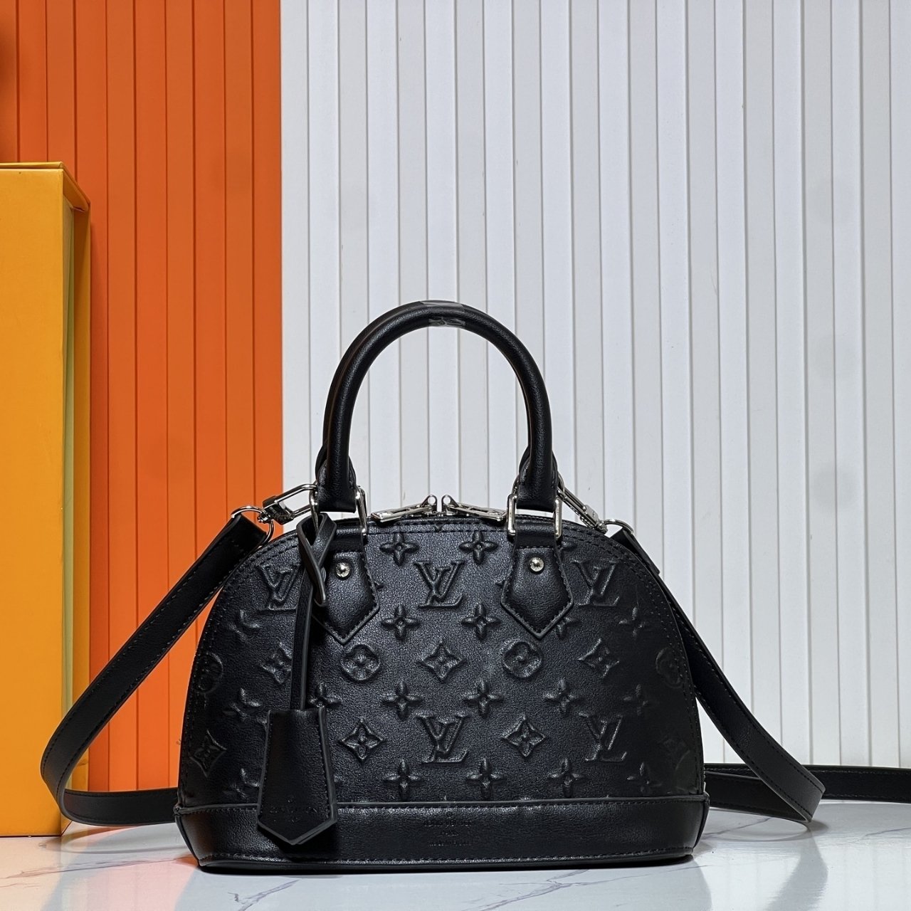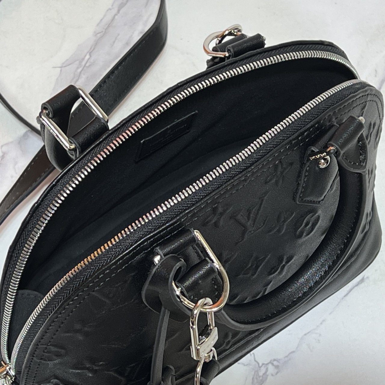This is a Louis Vuitton Alma BB bag in sleek black with embossed Monogram patterns. It features dual top handles, silver-tone hardware, and a detachable shoulder strap for versatile styling. The structured dome shape adds a timeless elegance, making it perfect for both day and evening wear.