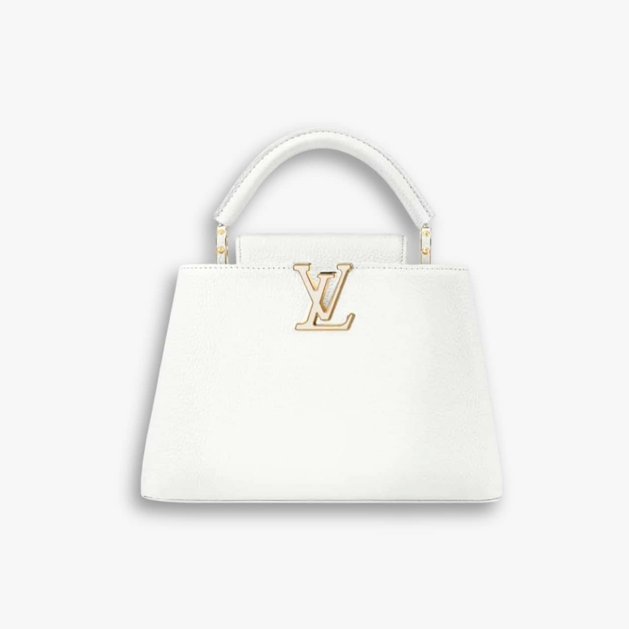 The Louis Vuitton Capucines BB in Snow White is a refined top-handle bag that exudes timeless elegance. Crafted from leather, it features the signature LV initials and a structured silhouette. Its versatile size and removable strap make it perfect for both formal occasions and elevated everyday wear.
