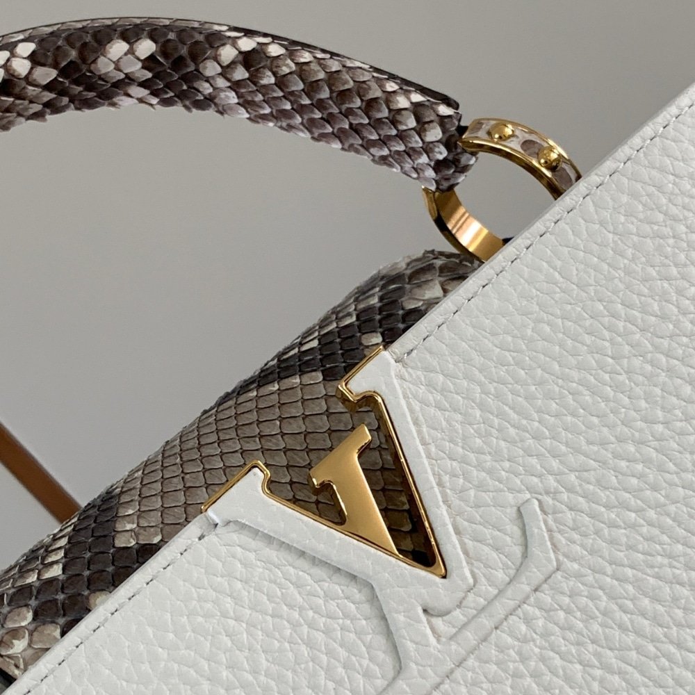 It was on the Rue des Capucines in Paris that the first Louis Vuitton store opened its doors. As timeless as the House itself, the Capucines bag brings chic sophistication to any look. Full-grain leather combines with python to create a luxurious handbag accented with heritage details: the LV initials, the distinctive side rings and the subtle Monogram flower on the closing flap.