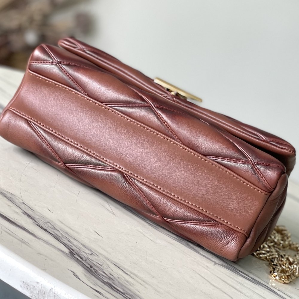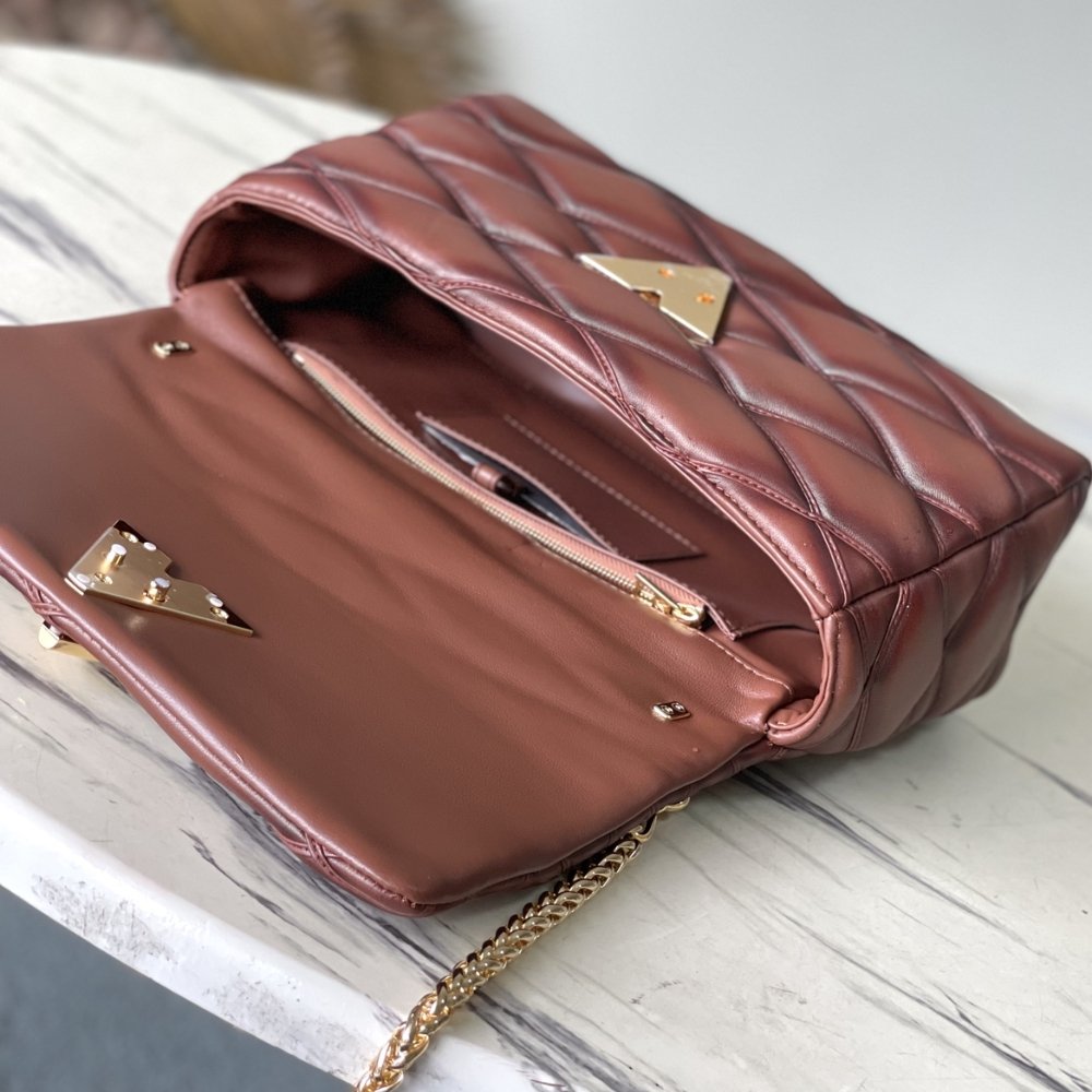 Louis Vuitton GO-14 MM Tan 31Cm . Nicolas Ghesquière explores new techniques to embellish the GO-14 MM handbag. Here padded lambskin is quilted, and a refined toasted effect is applied by hand, giving it a futuristic allure. The top handle and adjustable chain – both detachable – enable carry options. It’s signed with the House’s emblematic LV Twist lock.