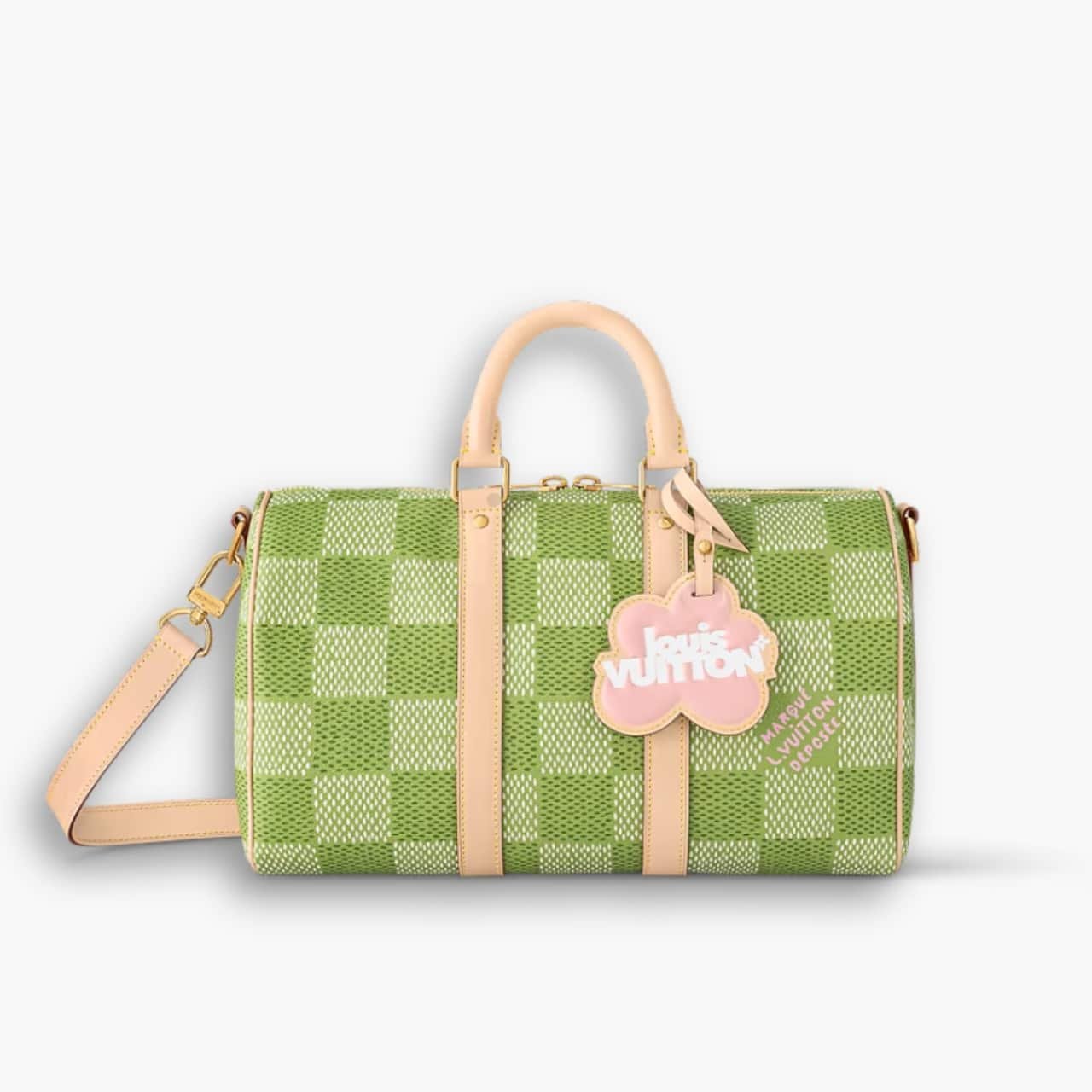 the Keepall Bandoulière 35 is crafted from Damier Golf Canvas with a light beige leather trim. The green body of the bag highlights the pink floral accessory with Louis Vuitton lettering and the pink “Marque L.Vuitton déposée” text in a Damier square.