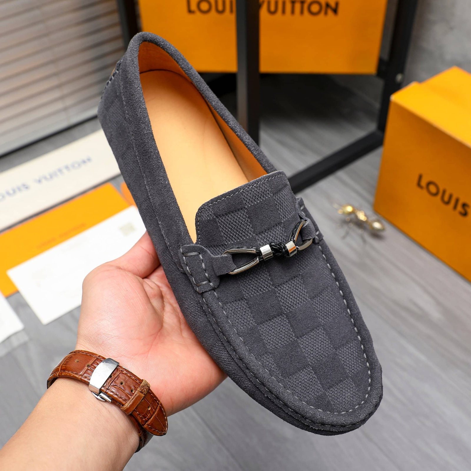 Be the first to review “Louis Vuitton Lv Damier Suede Leather Loafers In Grey” Cancel reply