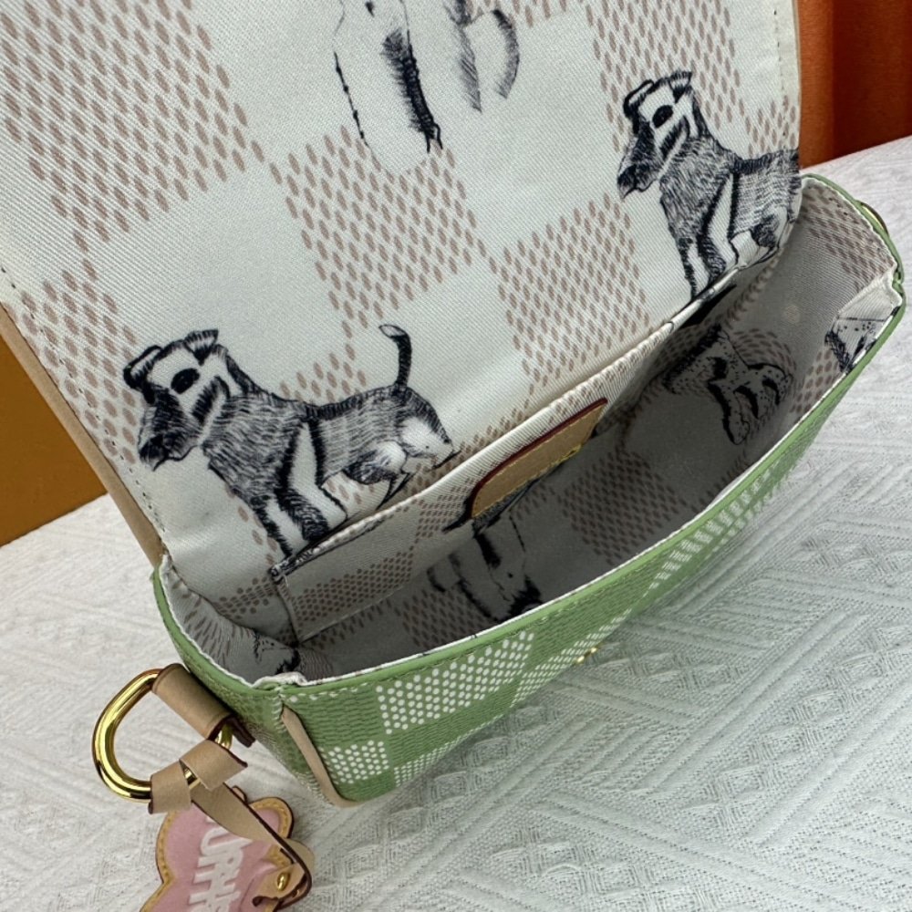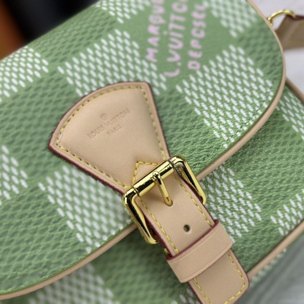 Made from Damier Golf canvas with leather trim, the Montsouris Messenger is a compact cross-body bag with a rounded flap. The pastel green checkerboard and daring pink Louis Vuitton flower charm give this small bag a stylish feel while the Montsouris’ magnetic buckle closure brings a vintage touch. The shoulder strap is adjustable and detachable.