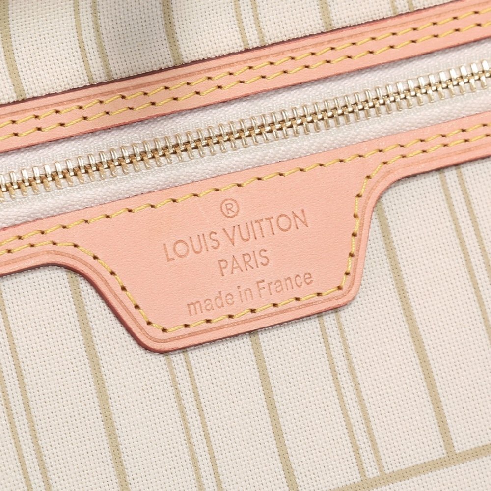 The Neverfull MM tote unites timeless design with heritage details. Made from fresh Damier Azur canvas with natural cowhide trim, it is roomy yet not bulky, with side laces that cinch for a sleek allure or loosen for a casual look. It features a removable pouch which can be used as a clutch or an extra pocket.