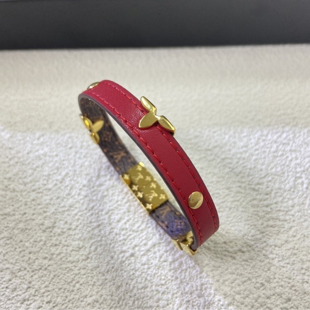 - Louis Vuitton monogram leather that reverses to red leather bracelet with yellow gold plated LV motifs
