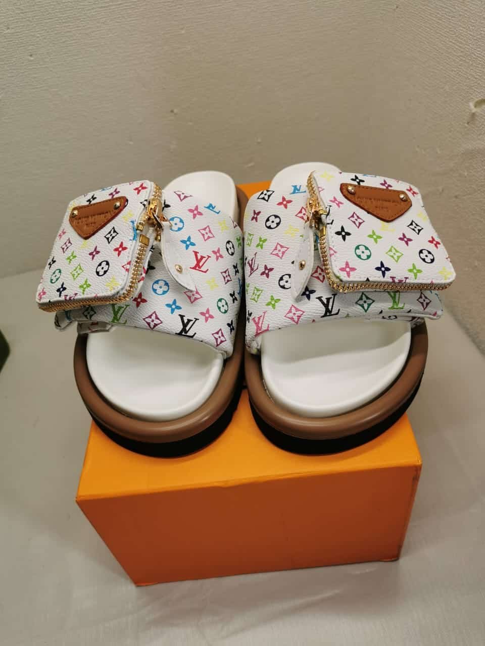 The Pool Pillow flat comfort mule from the cross-category Louis Vuitton x Murakami collection makes a bold contemporary statement thanks to a wide, padded velcro strap embellished with a zipped pouch. The allover Monogram motif is vibrantly uplifted in cheerful tones inspired by Japanese artist Takashi Murakami’s signature multicolored aesthetic, while an anatomic footbed and lightweight treaded outsole offer casual comfort.