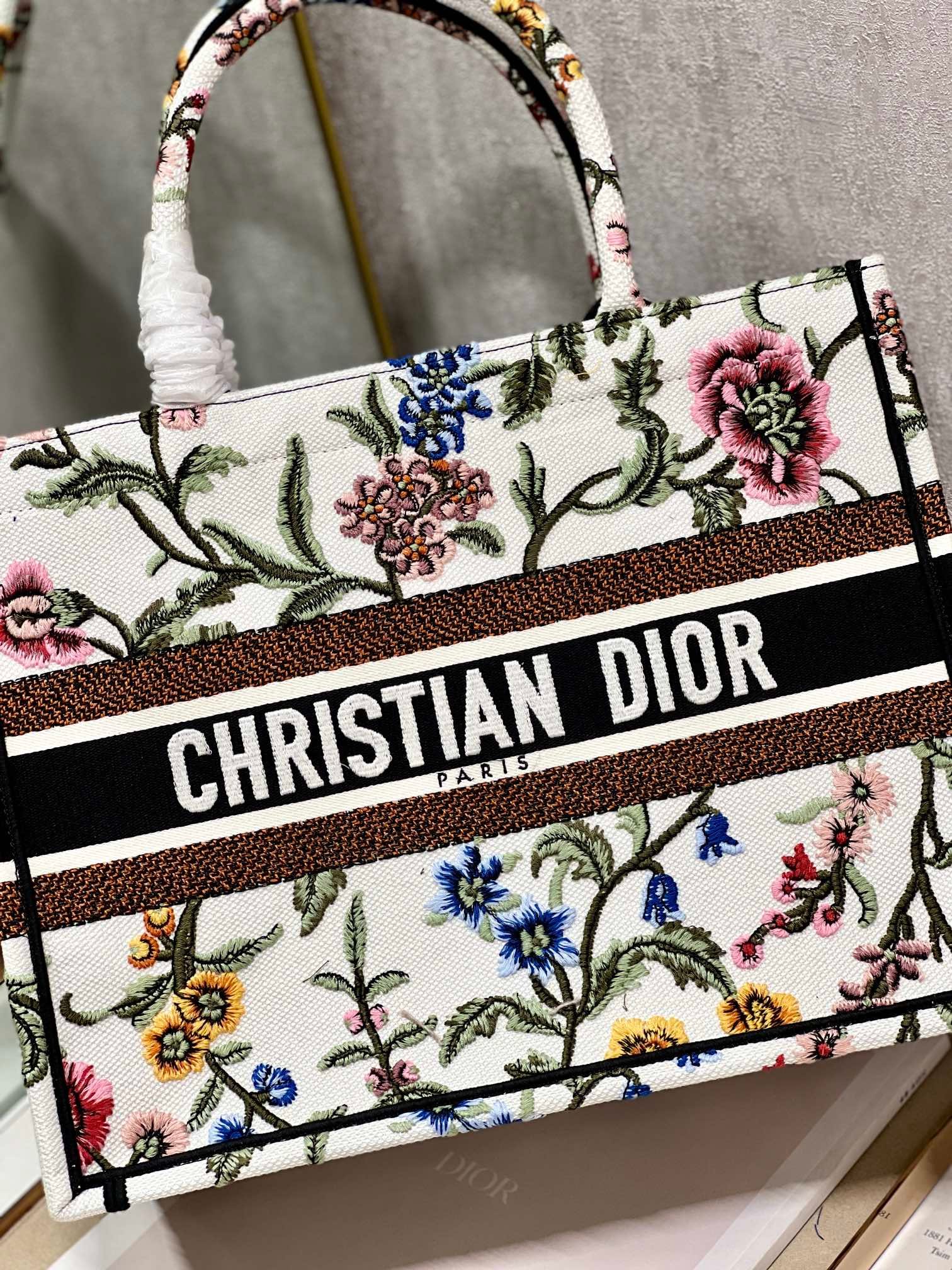 Introduced by Maria Grazia Chiuri, Creative Director of Christian Dior, the Large Dior Book Tote Bag has become a staple of the Dior aesthetic. Designed to hold all daily essentials, the style is fully embroidered with a multicolor Dior Petites Fleurs motif, a romantic and vibrant homage to Mr. Dior’s passion for florals. Adorned with the Christian Dior Paris signature on the front, the small tote exemplifies the House’s signature savoir-faire and may be carried by hand.