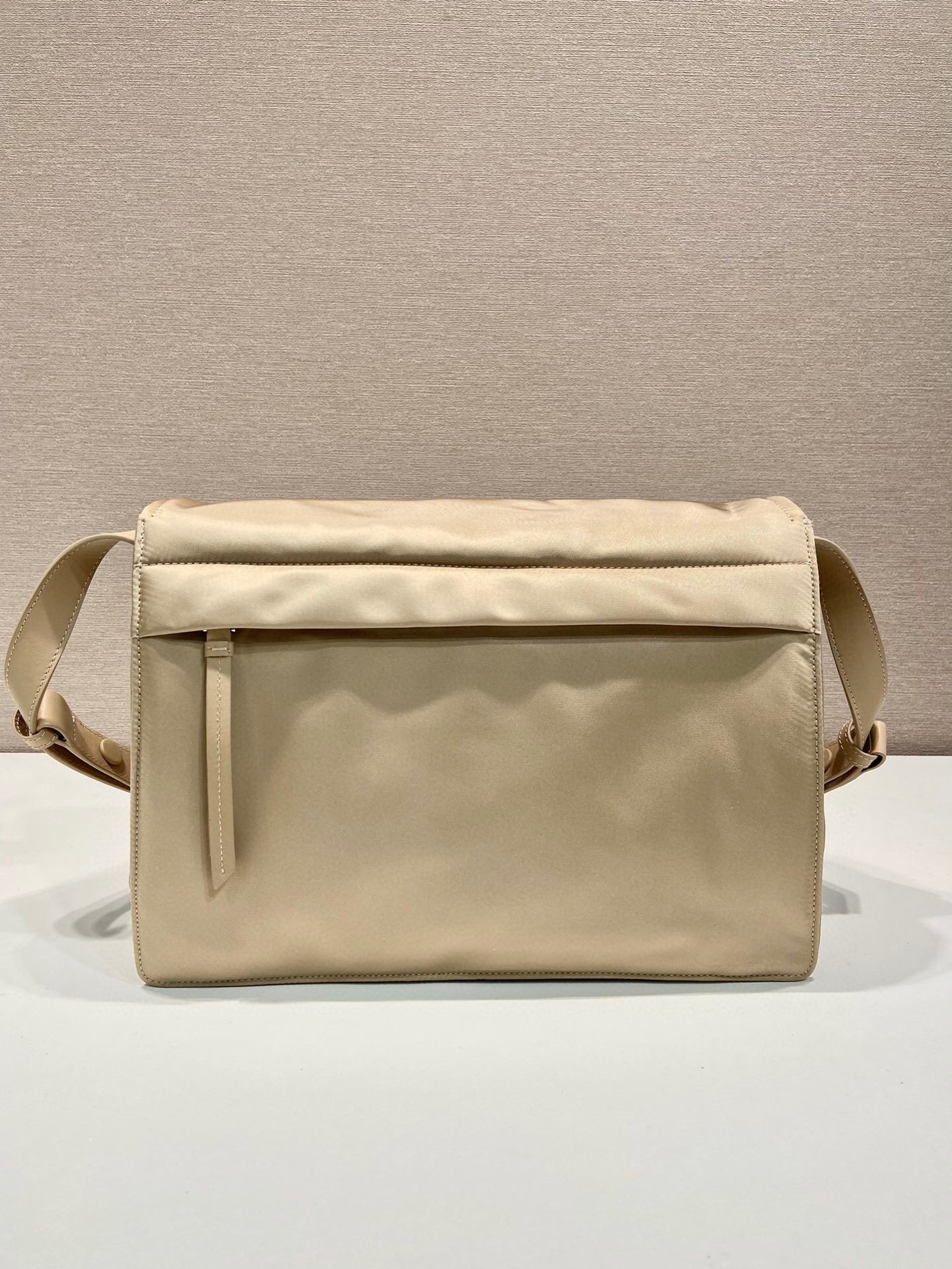 This shoulder bag made of padded Re-Nylon, the distinctive innovative material of the brand, comes with a leather shoulder strap. The accessory completed by a back pocket is illuminated with metal hardware and is decorated with the metal triangle logo that stands out on the flap.