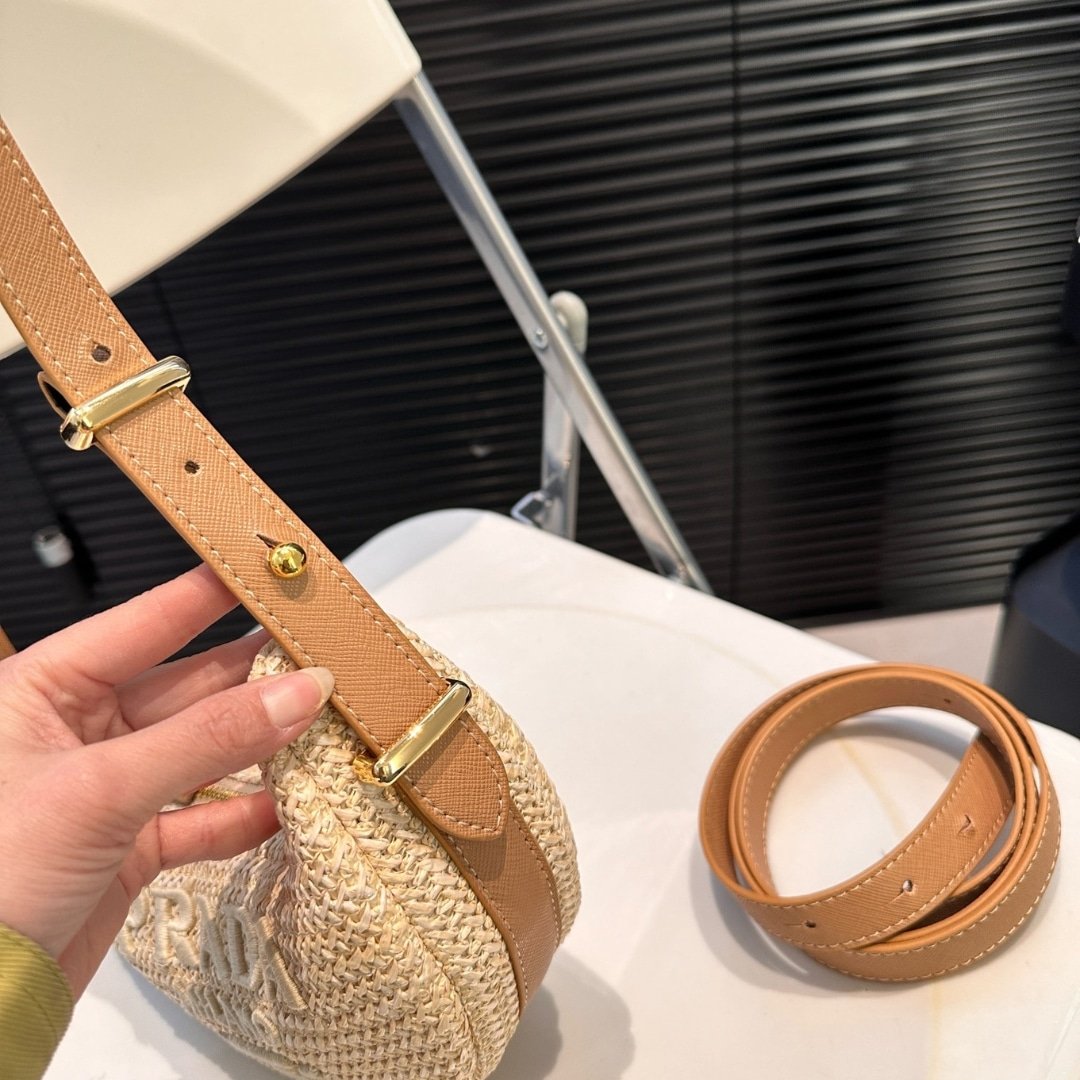 Prada Arqué Crochet Shoulder Bag Natural 22cm 1BC194 2M2T F0018 V OUO features hand-woven raffia in a soft natural tone. Signature details include the iconic triangular Prada logo and a minimalist crescent silhouette. Equipped with a slim shoulder strap, this 22cm bag offers a light, airy aesthetic perfect for summer days and casual elegance.