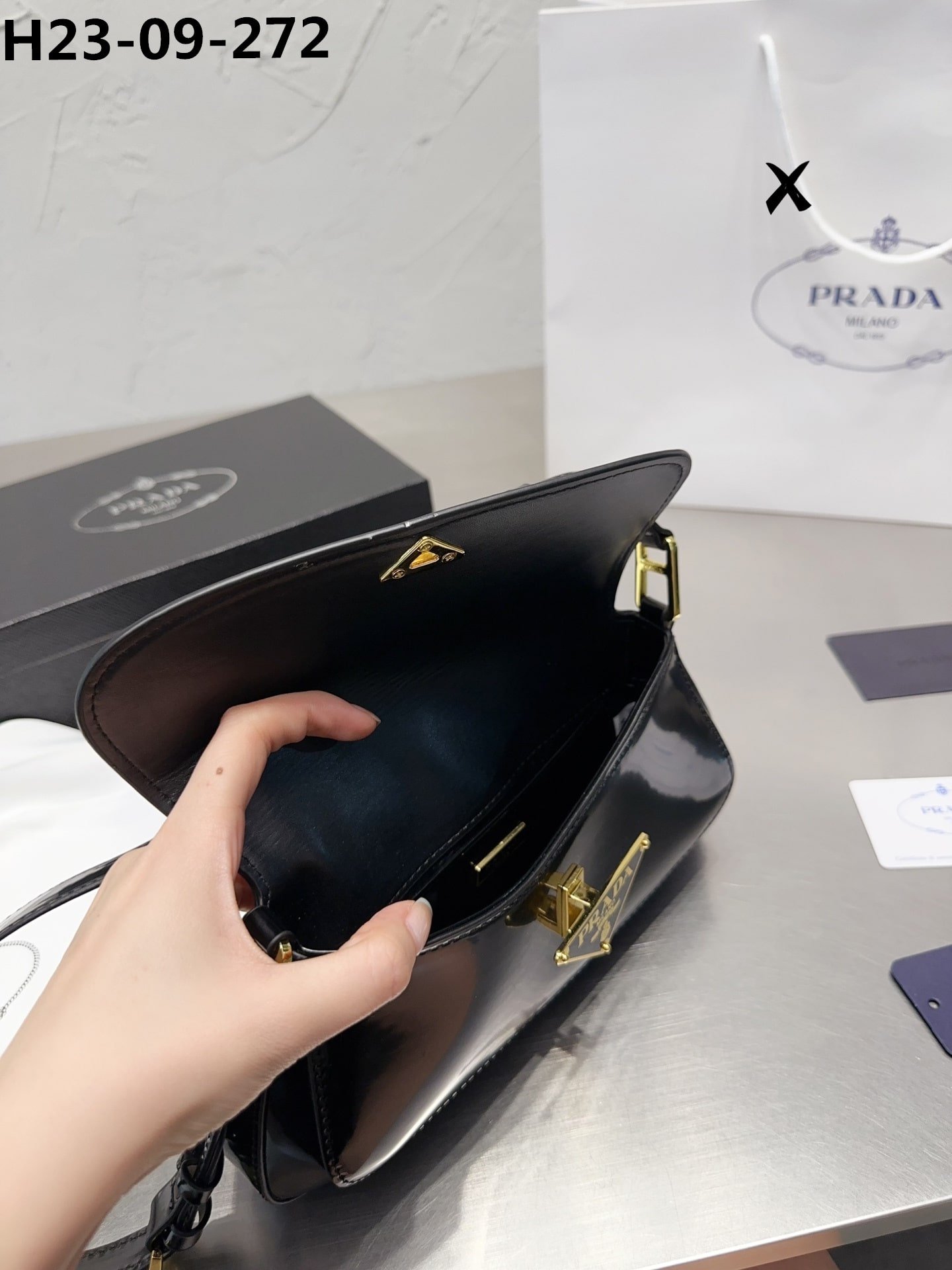 - Enameled metal triangle logo on the flap