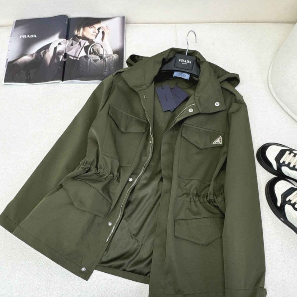 - PRADA Hooded Windbreaker in green features a zipper and pockets , the garment is decorated with the iconic enameled metal triangle logo