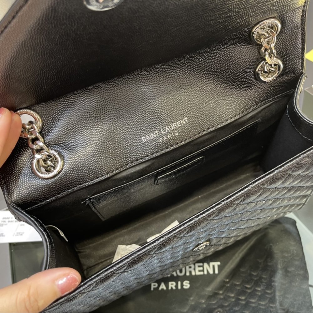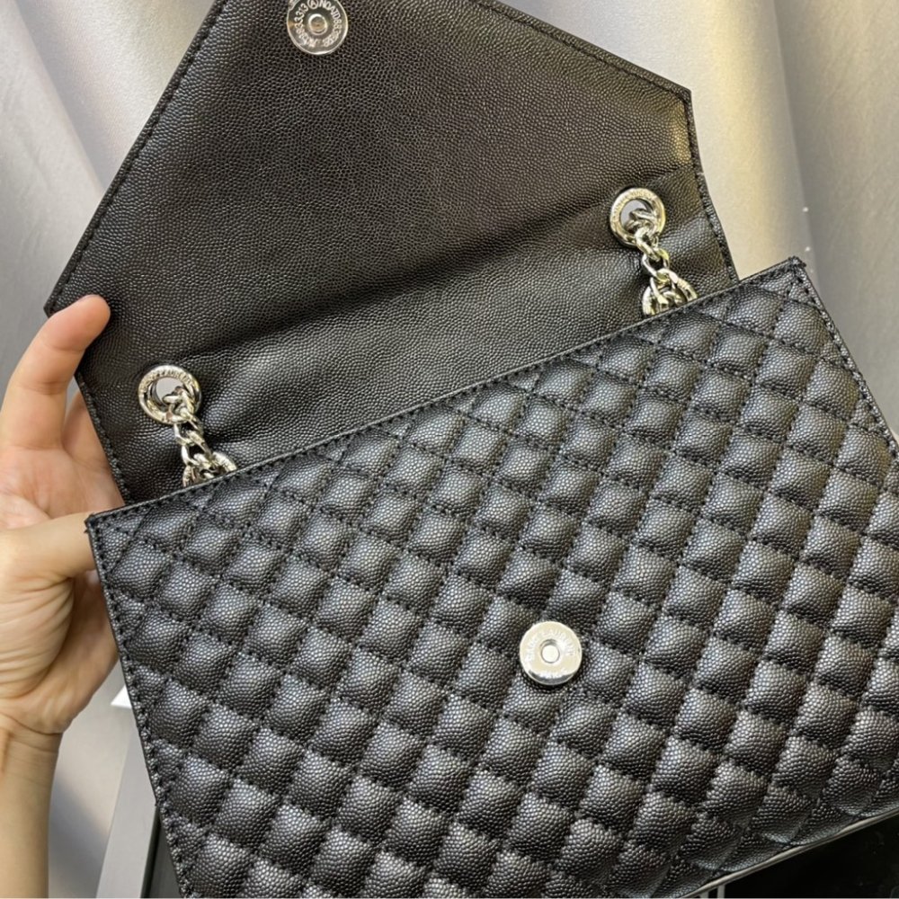 The Saint Laurent Envelope Medium Bag in black quilted grain de poudre embossed leather is a stunning blend of luxury and modernity. Featuring mirror-effect hardware, this 24cm bag exudes sophistication while maintaining a sleek, structured silhouette. A versatile accessory that effortlessly elevates any outfit.