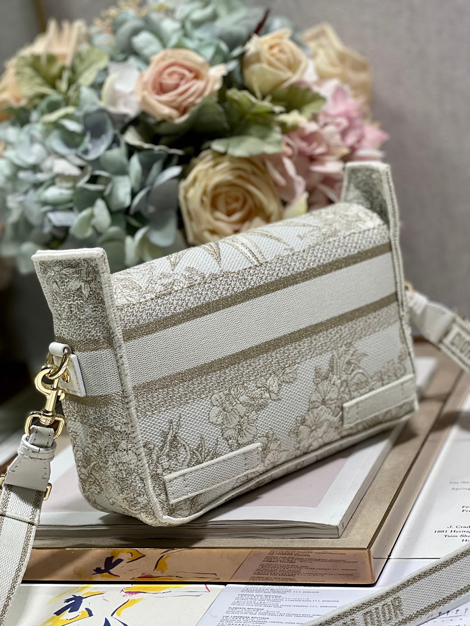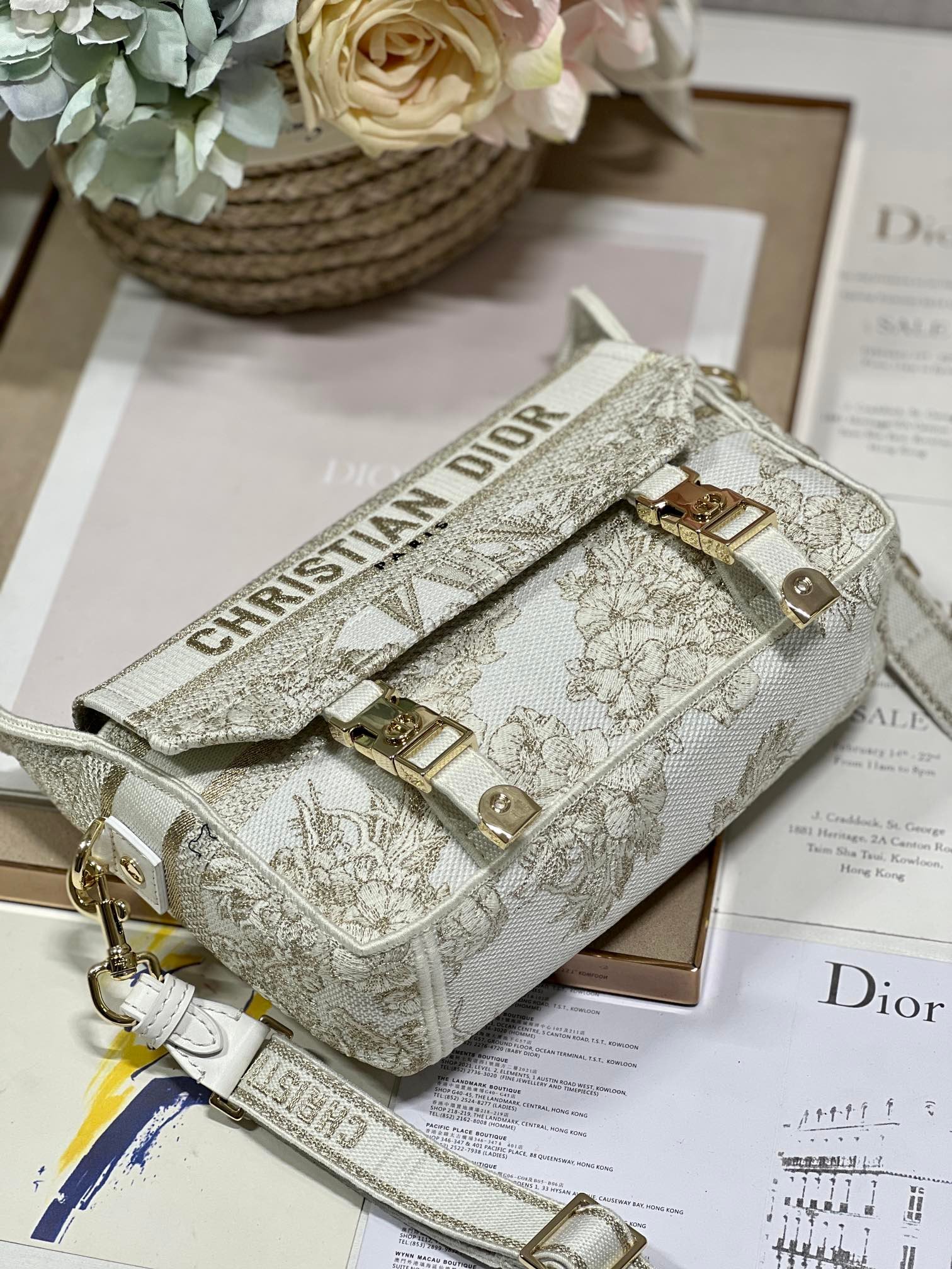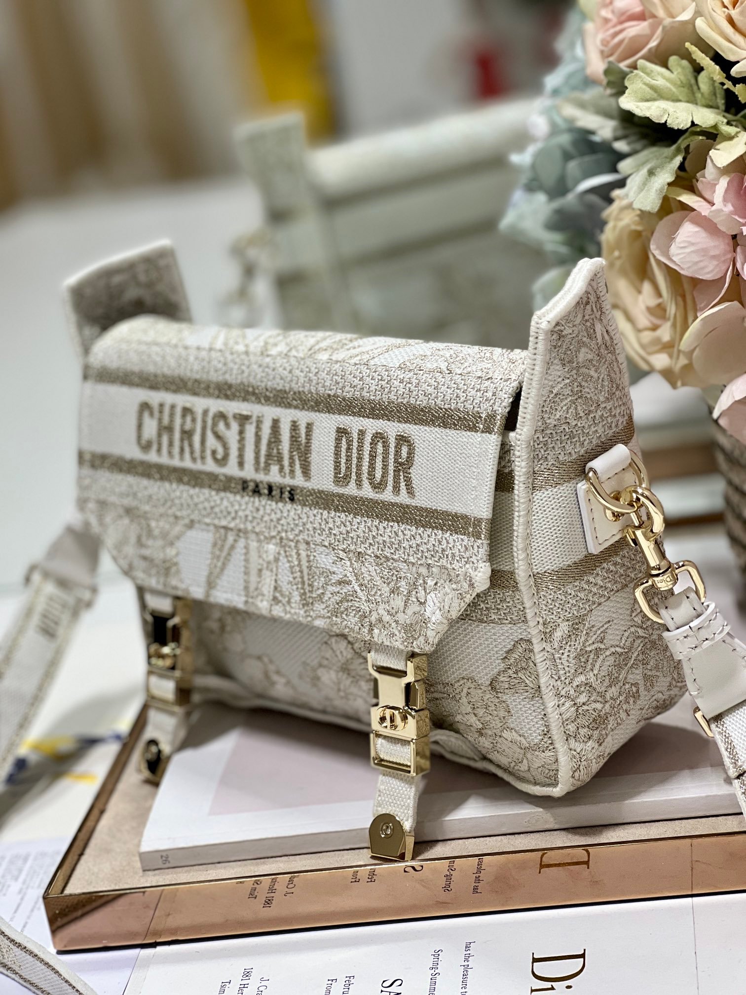 Maria Grazia Chiuri has updated the classic Messenger bag by adding signature Dior details for a relaxed and modern look. Small Diorcamp Bag is fully embroidered with the Dior Jardin d’Hiver motif embellished with gold-tone metallic thread, A ‘CHRISTIAN DIOR PARIS’ signature flap, as well as sportswear-inspired ‘CD’ buckles complete the design. Equipped with an adjustable and removable shoulder strap, the small, compact Messenger bag can be worn over the shoulder or crossbody, making for an ideal urban companion.