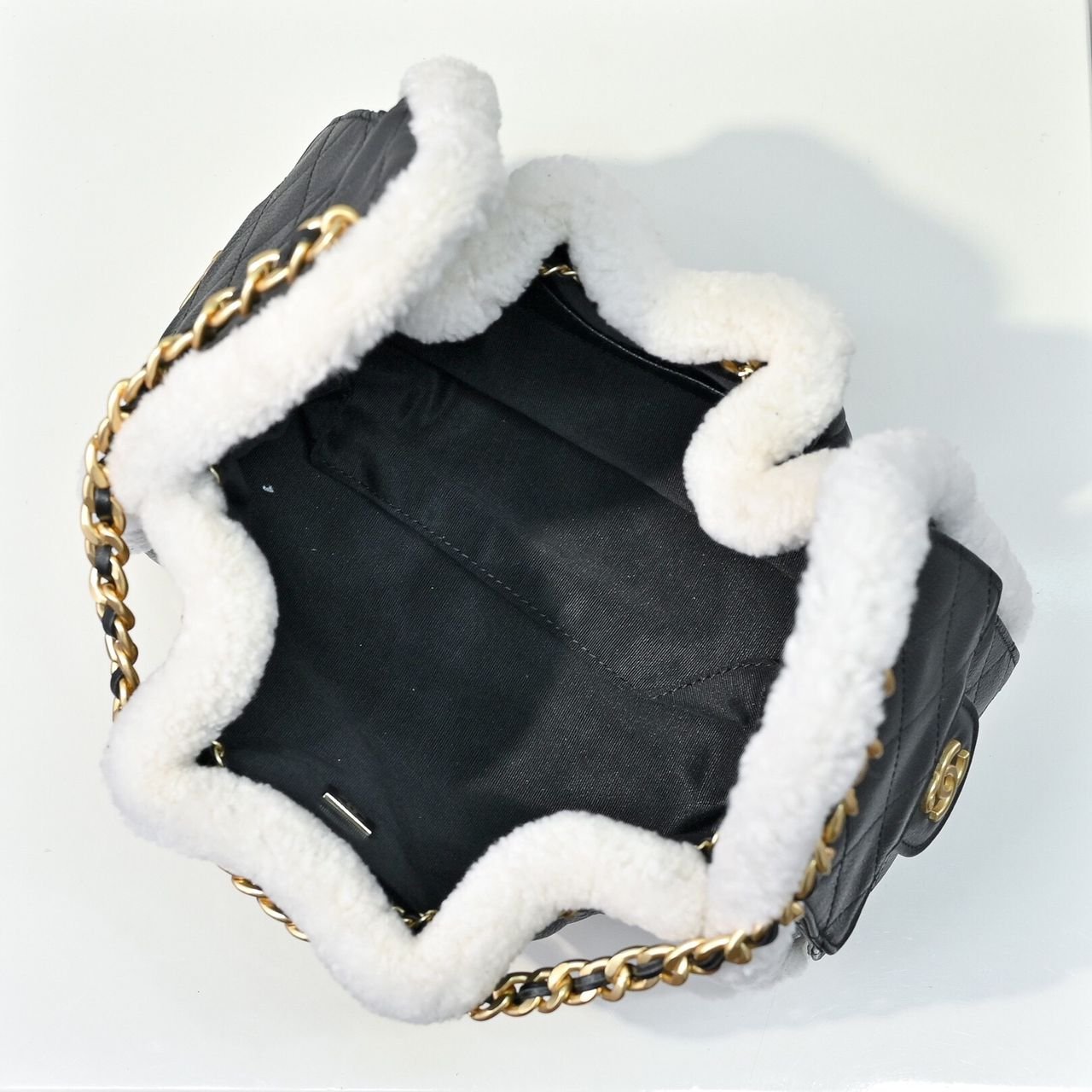 An elevated reinterpretation of Chanel’s timeless quilted design, this drawstring tote is crafted in supple black, trimmed luxuriously with a cozy yet refined touch. Side flap pockets add function without compromising elegance, making this tote both practical and irresistibly chic.